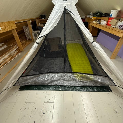 Hillebergtält med tillhörande tältpinnar och packpåse. Använt ca 20 nätter. Inga märken eller skador frånsett två mycket små brännhål på ovansidan i fotändan då tältet stod för nära en eld. Lagat med Hillebergs laglappar för tre år sedan och påverkar inte funktionen alls.