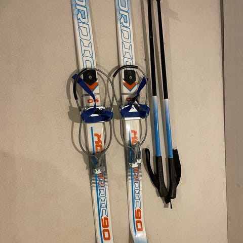 Edsbyn Classic (120 cm) med stavar (90 cm) i mycket gott skick. Universalbindning som fungerar med vanliga vinterkängor.