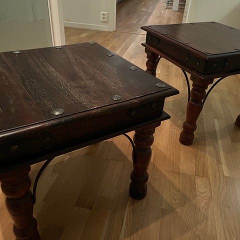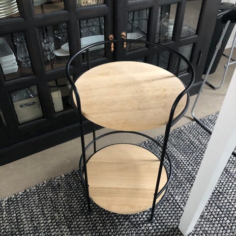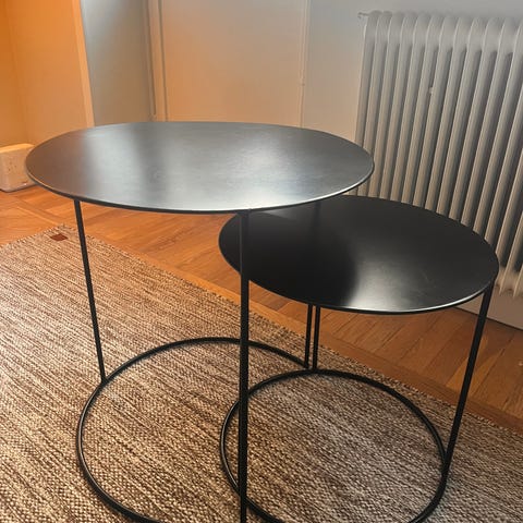 Säljer ett lågt sidobord i målad metall som har rund bordsskiva med låg kant. Bordet kan användas inomhus såväl som utomhus. Höjd ca 32 cm. Diameter 53 cm. Vikt ca 2,2 kg.