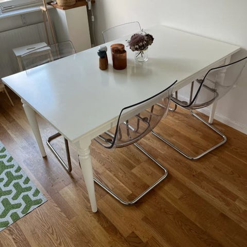 Fin och rymlig matbord som kan fällas på båda sidor för extra utrymme! Det tillkommer 4 stolar, den ena visas ej på bild men är i samma bra skick.