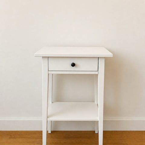 Charmigt, fint äldre sängbord i trä ommålat i vitt med guldfärgat handtag. Finns två små märken i färgen på ovansidan, se bild.