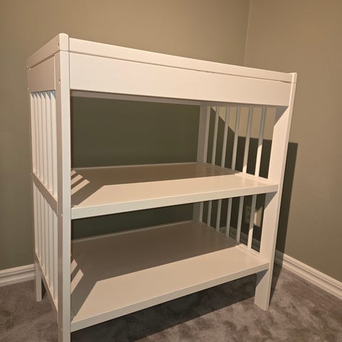 IKEA barnmöbel skötbord i vit färg med två hyllplan och öppna sidor. Måtten är 85 cm höjd, 82 cm bredd och 54 cm djup. Skötbordet är utformat för barn och erbjuder förvaringsutrymme under skötytan.