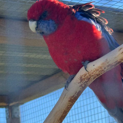 Han visslar när han är i buren och han brukar vara ute, men att man måste vara nära honom för ibland kan han flyga och då vet han inte vart han ska ta vägen pga starkt ljus eller något som han når upp till.