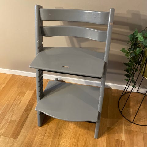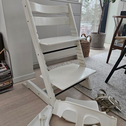 Stokke Tripp Trapp barnstol i trä (köpt från Babyland 2022 för 2246 kr) i vit färg. (ommålad i vitt från warm brown). Använd av ett barn.