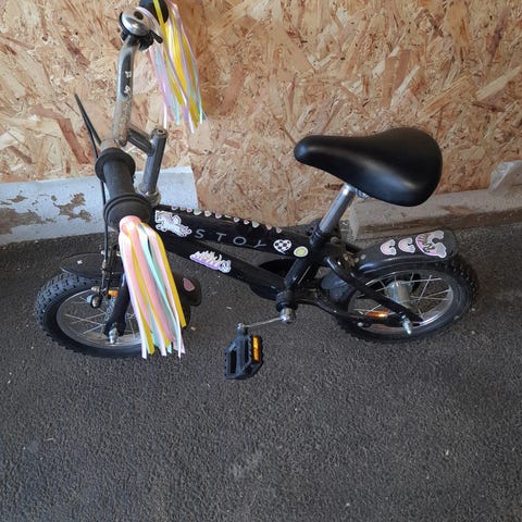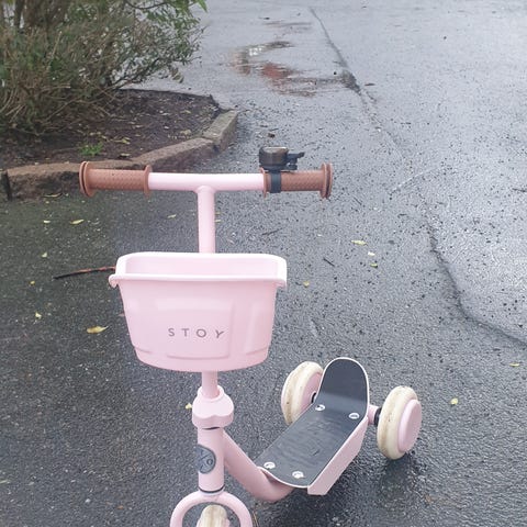 Säljer en fin trehjuling från Stoy med praktiskt föräldrahandtag och liten korg på styret.