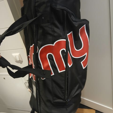 Golfbagen är utrustad med hjul för enklare transport och har ett slitstarkt material.