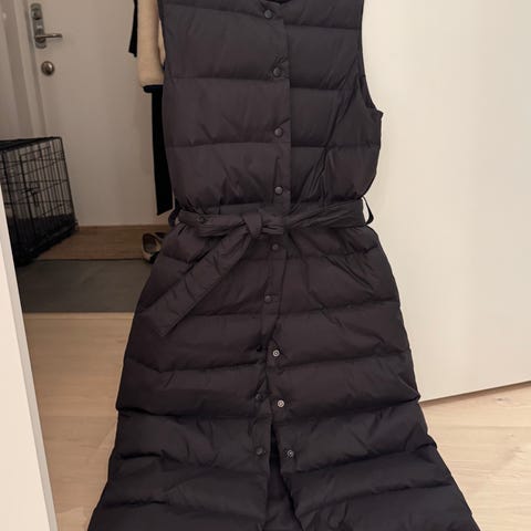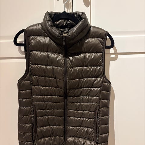 Trendig lång mysig tjock dun väst med huva. Exklusiv djup grön färg. Fickor fram. Lång zipp i sidan. Kort zipp fram. Fram fickor. Trendig varumärke Indyeva köpt i Whistler Kanada förre året och aldrig använt.