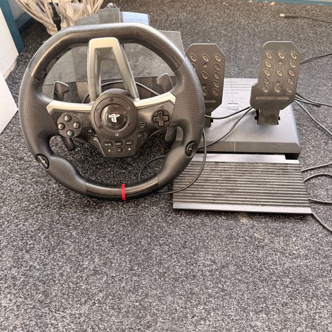 Thrustmaster T80 Ferrari ratt och pedaler. Inkluderar ratt med knappar och växelpaddlar samt pedalenhet med gas och broms. Passar bl.a PS4 och PC.