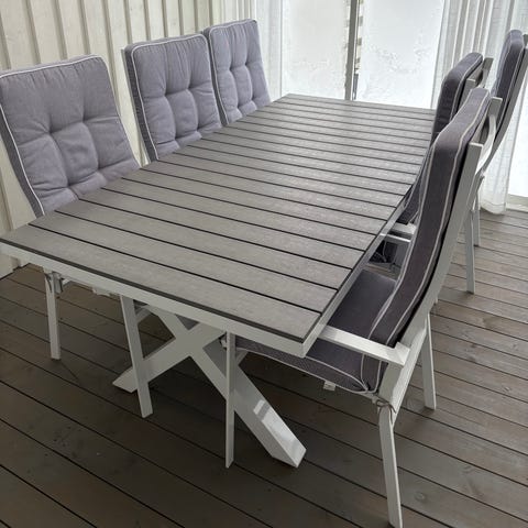 Säljer bord med 2 klaffar samt 8 svarta stolar från ILVA (portio trädgårdsstol). Bordet är i teak och metall. Stolarna är 70% vetefiber och 30% plast. I bilden har bordet endast 1 klaff.