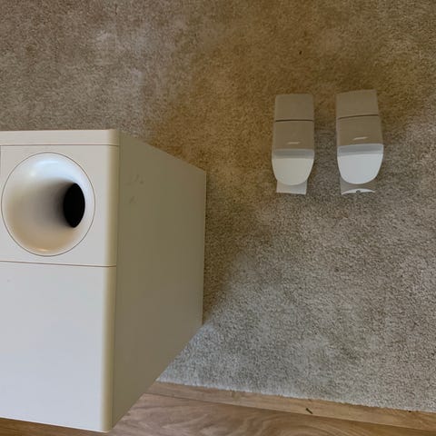 Bose 2.1 högtalarsystem med subwoofer och två satellithögtalare. Förstärkaren har inbyggd dvd spelare.
