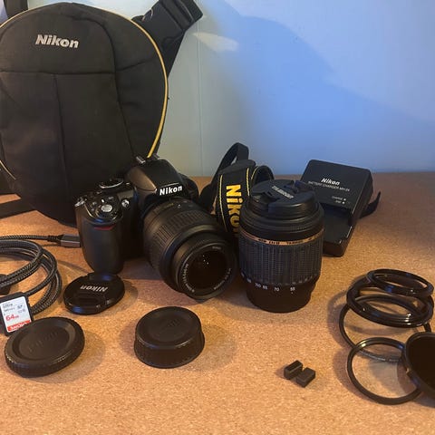 Med laddare, objektiv (18-55)och extra objektiv 55-200. Sparsamt använd. Instruktionsbok. En väska medföljer.