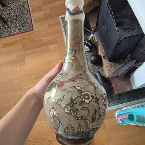 Mässing och emalj. Vackert dekorerad med fågel och blomsterkvistar. Vas som dekoration inredningsdetalj. Höjd 12.5 cm. Bredd 12.5 cm ( mittenparti). Tjocklek cirka 5 cm.