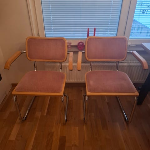 Svart Klassisk Bauhausstol i bok och rotting med rörformat kromat stålstativ från Svenska Inredningar. Ena stolen har några märken på armstödet som kan fixas till med lite svart glansig möbelfärg. Rottingdelen är hel och fin. Säljer för 800kr styck eller 1500kr för två.