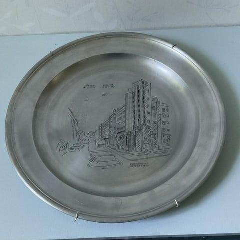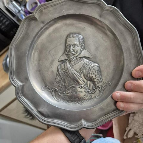 Fyra tennfat med porträtt av olika kungar. Fatens design inkluderar detaljrika kungaporträtt och dekorativa kanter. Passar som samlarobjekt eller för dekorativt bruk.