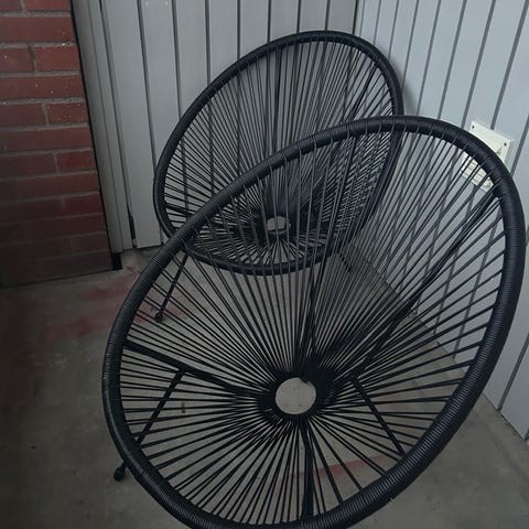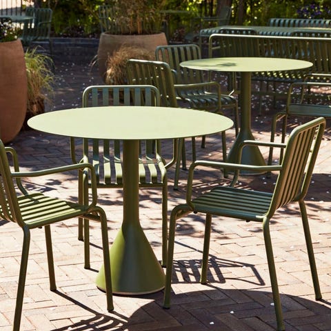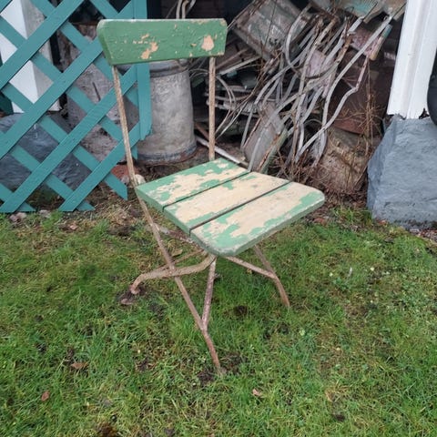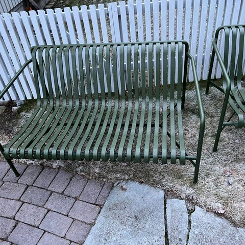 Grön stol tillverkad i metall med en design bestående av horisontella metallstavar. Stolen har en robust konstruktion och är lämplig för både inomhus- och utomhusbruk. Det finns grå dynor till. Priset är diskuterbart