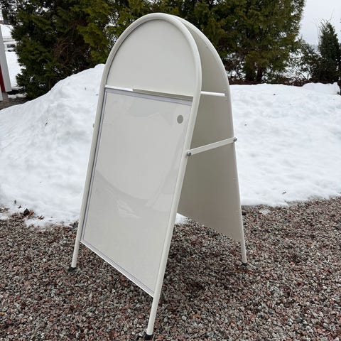 Skyltställ i metall med vikbar design. Kan användas för att visa information eller reklam utomhus eller inomhus. Stabil konstruktion med två sidor för att maximera synlighet.