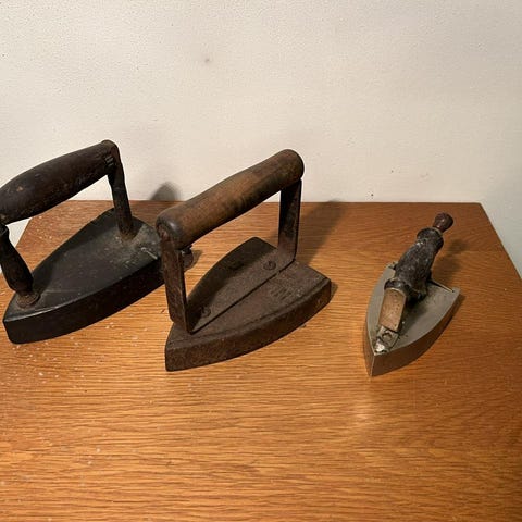 Gammalt strykjärn i gjutjärn med trähandtag