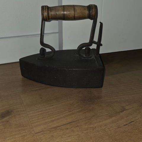 Gammalt strykjärn i gjutjärn med trähandtag.