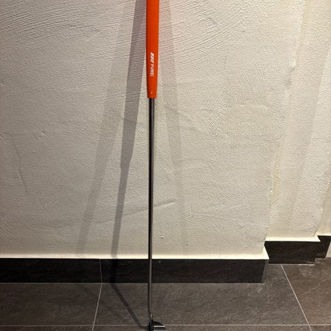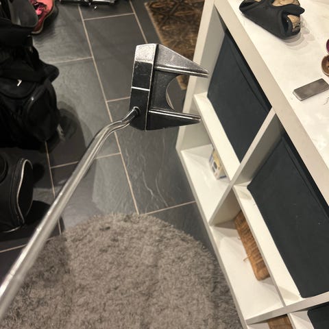 Odyssey White Hot #5 putter med en metallkropp och grepp märkt Odyssey. Högerklubba