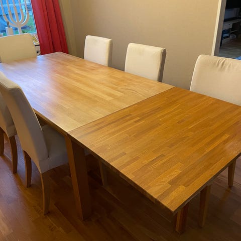 Stabilt matbord med 6 stolar i ek. Synligt använd bordsskiva, några bulor och mindre tuschfläckar men ser överlag fräscht ut.