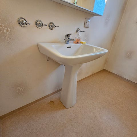 Handfat med pelare i vitt utförande. Utrustad med en guldfärgad blandare med två vred för varm och kallvatten.