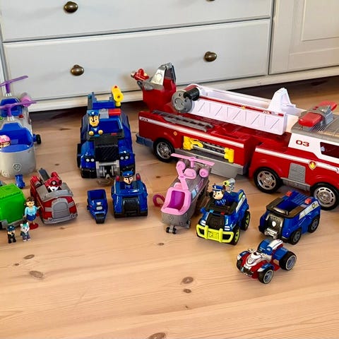 Paw Patrol leksakssats bestående av flera fordon i olika färger och modeller samt en lekstation med flera våningar och detaljer. Setet inkluderar olika figurer och tillbehör för lek och rollspel.