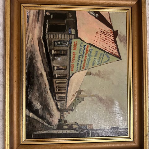 Huset i gläntan. Målning som föreställer ett hus med grönt tak omgivet av grönska under en blå himmel med moln. Målningen visar naturmiljö med träd och fält i bakgrunden.