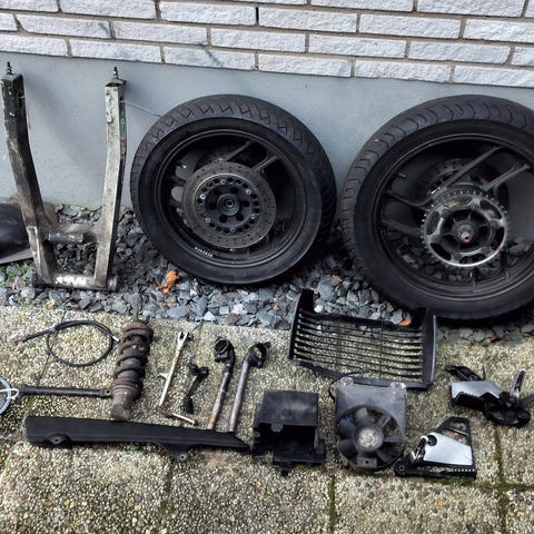 Fram fälg, batterilåda, stötdämpare, varvräknare med konsol , elkomponenter m.m .