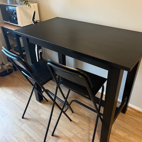 Smart barbord med 3 mindre hyllplan för förvaring på ena sidan. Från Jysk, 1 år gammalt. Barstolarna troligtvis från XXL Lutz, inköpt några år tidigare.
