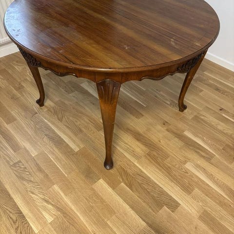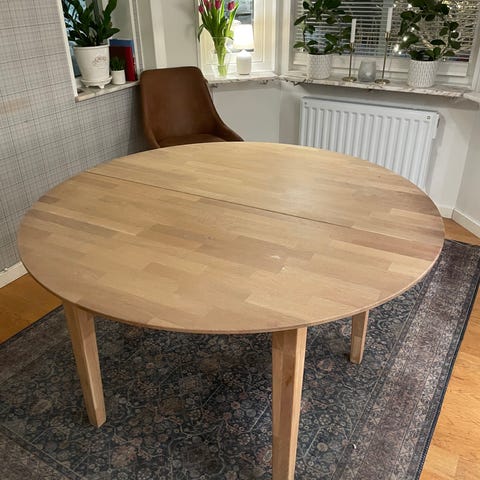 Snyggt runt matbord i ek (möjligen med ekfanér), perfekt för kök, matsal eller öppna ytor.