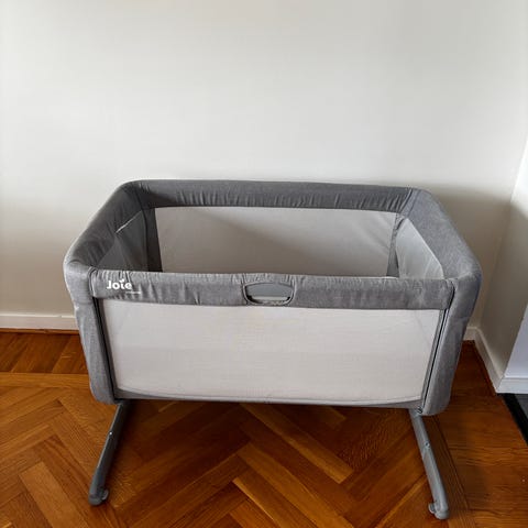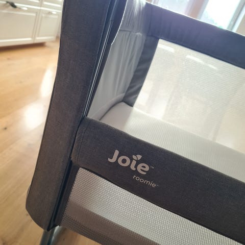 Jollyroom Roomie Glide Bedside Crib är en barnsäng som kan placeras intill föräldrasängen. Den har en neutral färg och är utformad för att underlätta närhet och tillgång till barnet under natten. Sängen är utrustad med nätpaneler för god ventilation och har justerbara funktioner för att anpassas till olika sänghöjder.