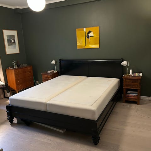 IKEA madrass i standardstorlek. Produkten består av två madrass som är anpassade för att användas tillsammans. Färgen är ljus med mörka detaljer och materialet är anpassat för sovrumsmiljö.