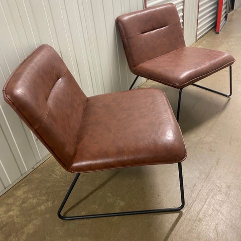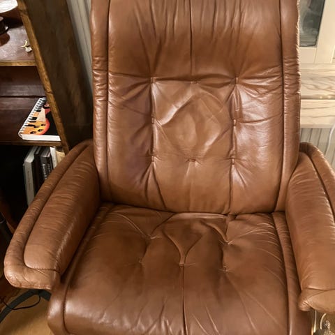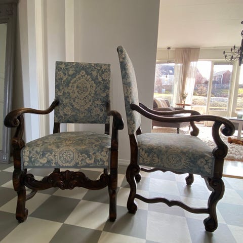 Två fåtöljer med tillhörande fotpall. Mycket bekväma fåtöljer som använts väl. Passar för sittplatser i vardagsrum eller läshörnor.