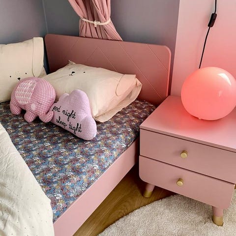 Bäddmadrassen och resårbottnen kommer från IKEA. Sänggaveln och sängbordet är av massivt trä och är specialbyggda av ett snickeri i Småland.