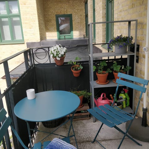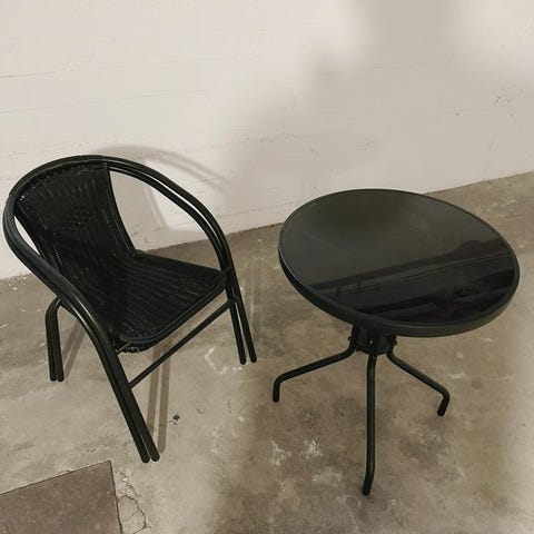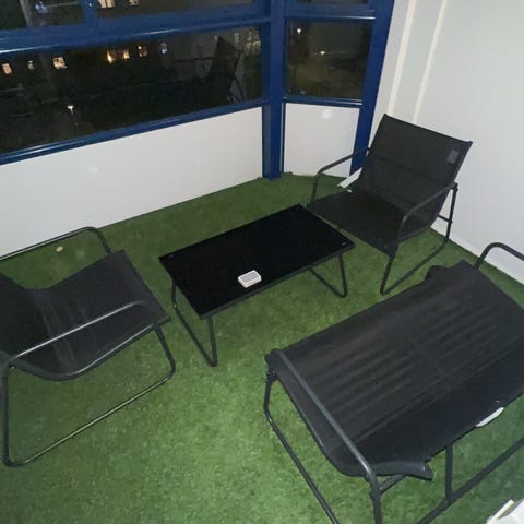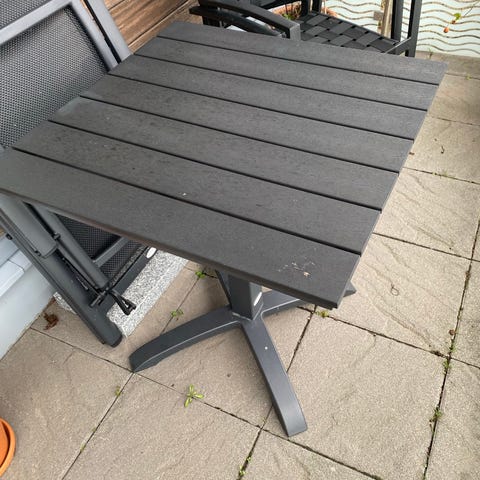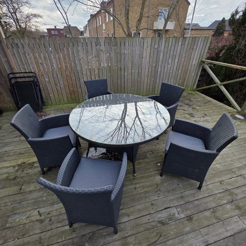 Utemöbler matgrupp bestående av ett rektangulärt bord med stenliknande bordsskiva och sex svarta stolar med armstöd och textilmaterial. Passar för utomhusbruk på altan eller trädgård.