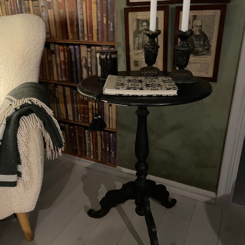 Pelarbord, bord på tre ben i mycket bra skick. H=58cm, D=48cm