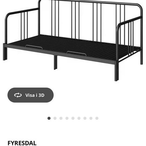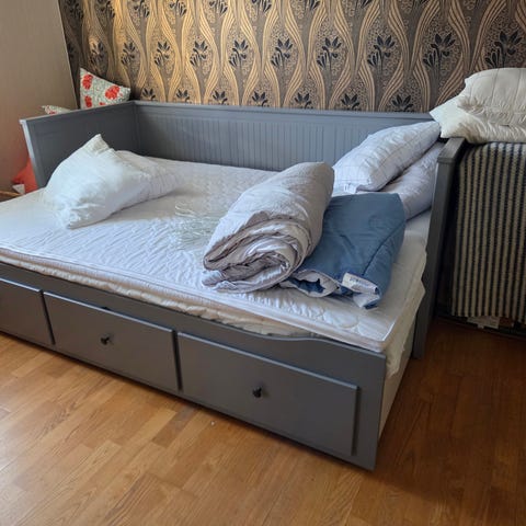 IKEA dagbädd i grå färg med tre lådor för förvaring under sängen. Sängen har en ram av trä och lamellbotten. Mått: 209 cm längd, 93 cm bredd och 83 cm höjd. Passar som en enkel dagbädd eller extrasäng.