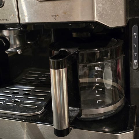 De'Longhi kaffebryggare med espressofunktion i rostfritt stål och svart plast. Utrustad med ångmunstycke för mjölkskumning.