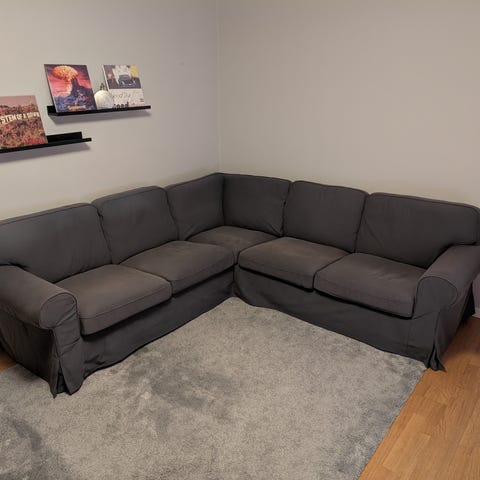 IKEA Ektorp hörnsoffa Hakebo mörkgrå säljes på grund av flytt. Pris i butik 9495kr. Monteras lätt isär i tre delar.Medtag bärhjälp.