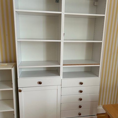 Säljer två flexibla hyllor som tidigare staplats på varandra. Den större är 149*149 cm hög/bred och 39 cm djup. De andra är 149*79 cm hög/bred och 39 cm djup. Varje fack är 33,5*33,5 cm.