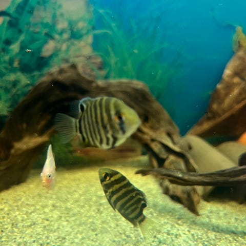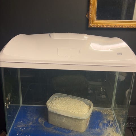Snyggt akvarium utan topplock och med möjlighet till utanpåfilter. Kommer med en pump men vet inte om den funkar.