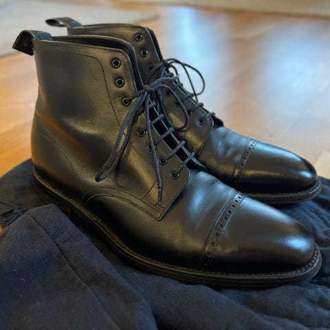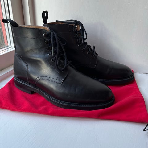 Derby Boot med högt skaft. Kalvskinn, black grain - lite mönstrat skinn. Bra gummisula, även med grepp på vintern.