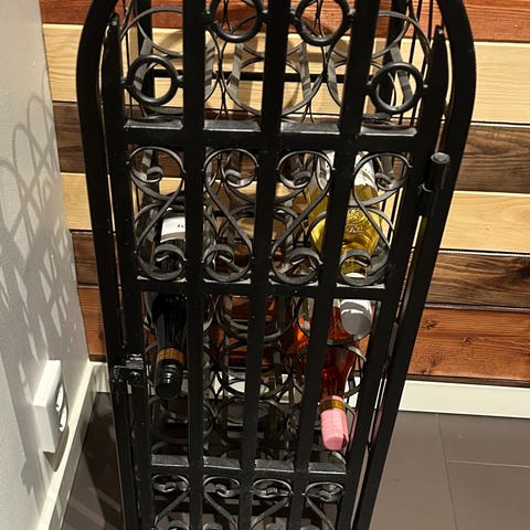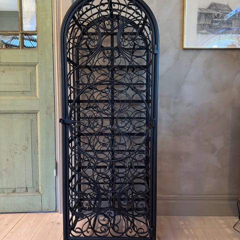 Stilrent vinställ i smide (svart), 70cm x 30cm x 18cm. Rymmer upp till 18 flaskor. Praktiskt och snygg inredningsdetalj.
