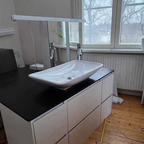 Ny kvalitetsmöbel i ek med flera lådor och skåp för förvaring. Inkluderar en stor spegel med belysning och eluttag . Handfat i vitt porslin integrerat i möbeln.