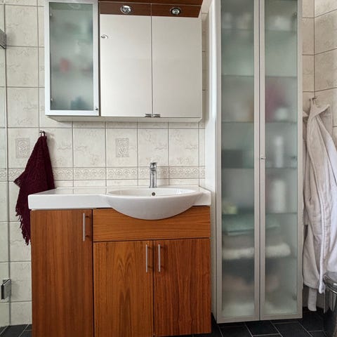 Björbo badrumsmöbel med spegel och handfat i trä och vitt porslin