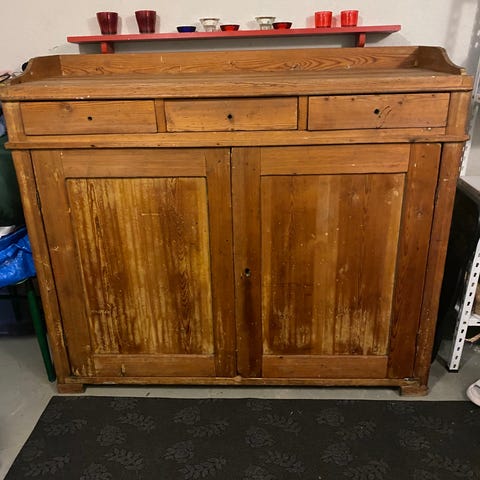 Antikt skåp tillverkat i trä med två lådor och två skåpdörrar. Skåpet har en sliten yta med färg i gult och en mörkare träskiva på toppen. Passar för förvaring och som möbel i olika rum.
