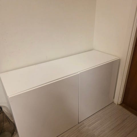 Säljer tre delar ur IKEA BESTÅ-serien – ett dubbelskåp och ett enkelskåp. Skåpen kan användas antingen ihop eller var för sig. Senast har de använts separat, vilket förklarar de olika benen, men som syns på första bilden har de även stått ihop.