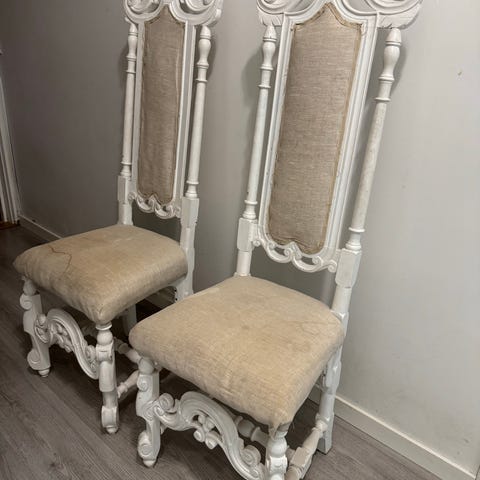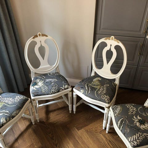 På grund av flytt säljer jag mina fyra vackra handgjorda Lindome stolar från orten Lindome i Göteborg som tillverkade stolar i slutet av 1800 talet, vitmålade, nu klädda med sammet (går att byta tyg). fantastiskt svenskt hantverk som ger karaktär i både kök/matsal. Skickas ej. Hör av dig för fler mått och info. Pris per styck.