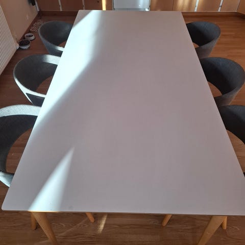 Ett bord från Mio med 6 st Matstol HAVNDAL svart konstläder/krom från Jysk allt är i ny skick inga märket eller skav eller slitage på någon stol bordet är i mycket bra skick med