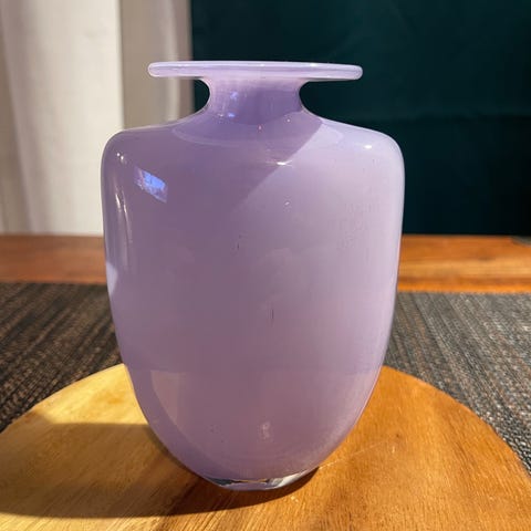 Värderad till 1000 kr. Glaset har en rolig och unik design med en klar kupa och en dekorativ gul rosett, blårandig / orange fot. Handblåst.